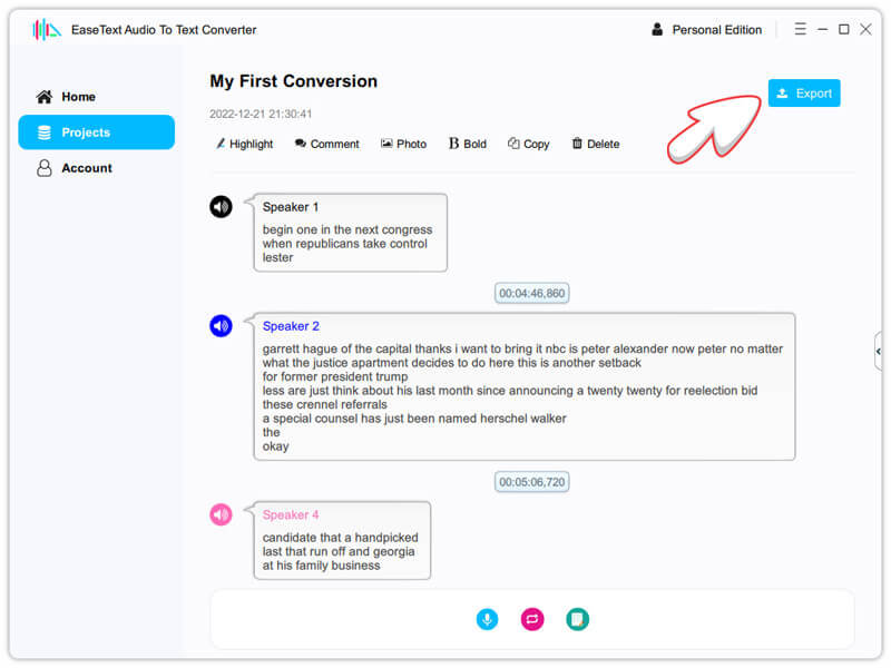 You may need to set the properties in the "Export Settings" dialog, such as file type, file location, speaker, timestamp, audio and highlights & comments. Click "Save" button after adjusting the settings to save file on computer.